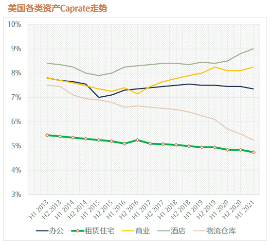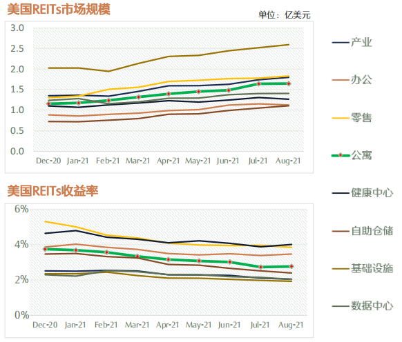 從2013年至今美國(guó)各類資產(chǎn)資本化率走勢(shì)來(lái)看,單看美國(guó)REITs市場(chǎng)規(guī)模和收益率走勢(shì),除了IDC、物流資產(chǎn)之外,投資人對(duì)長(zhǎng)租公寓的投資一直處于上升趨勢(shì)。