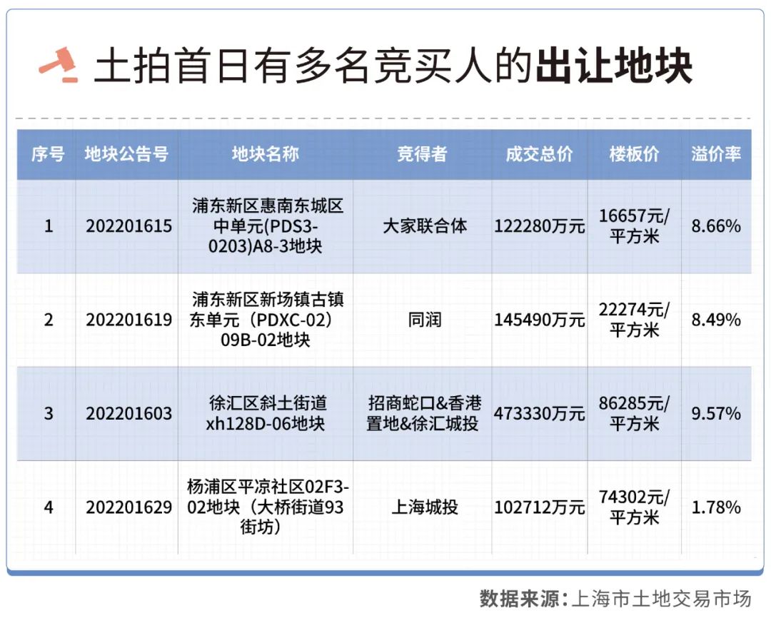 本次上海土拍共推出12個地區共計36幅地塊,土拍首日共成交20幅地塊,其中16塊底價成交,4幅地塊獲多名競買人報名,分別位于浦東(2幅)、徐匯(1幅)和楊浦(1幅),成交總金額495.32億元。