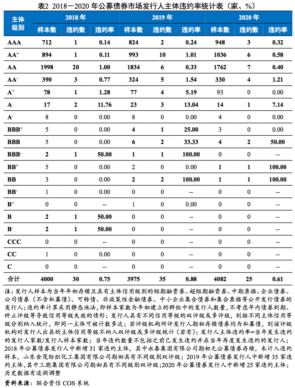 違約情況方面,2020年我國債券市場新增違約發行人30家,公募債券市場違約率為0.61%,違約常態化發生,信用風險進一步釋放,但違約發行人家數和公募債券市場違約率較2019年和2018年均有所減少;同時信用評級的違約預警能力整體有所提升。