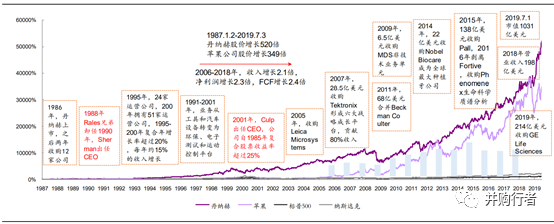 在過去的 30 多年中,丹納赫的股價變遷。超過蘋果、標(biāo)普500的增速: