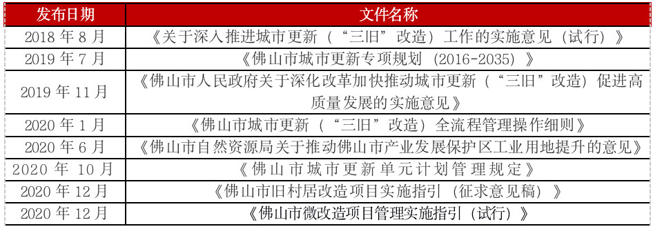 2018年,佛山發布《關于深入推進城市更新(“三舊”改造)工作的實施意見(試行)》,再度著重推進城市更新發展。2019年,在省政府等一系列文件的出臺支持下,佛山陸續推出了多項規劃和實施規范文件,加速城市更新發展。