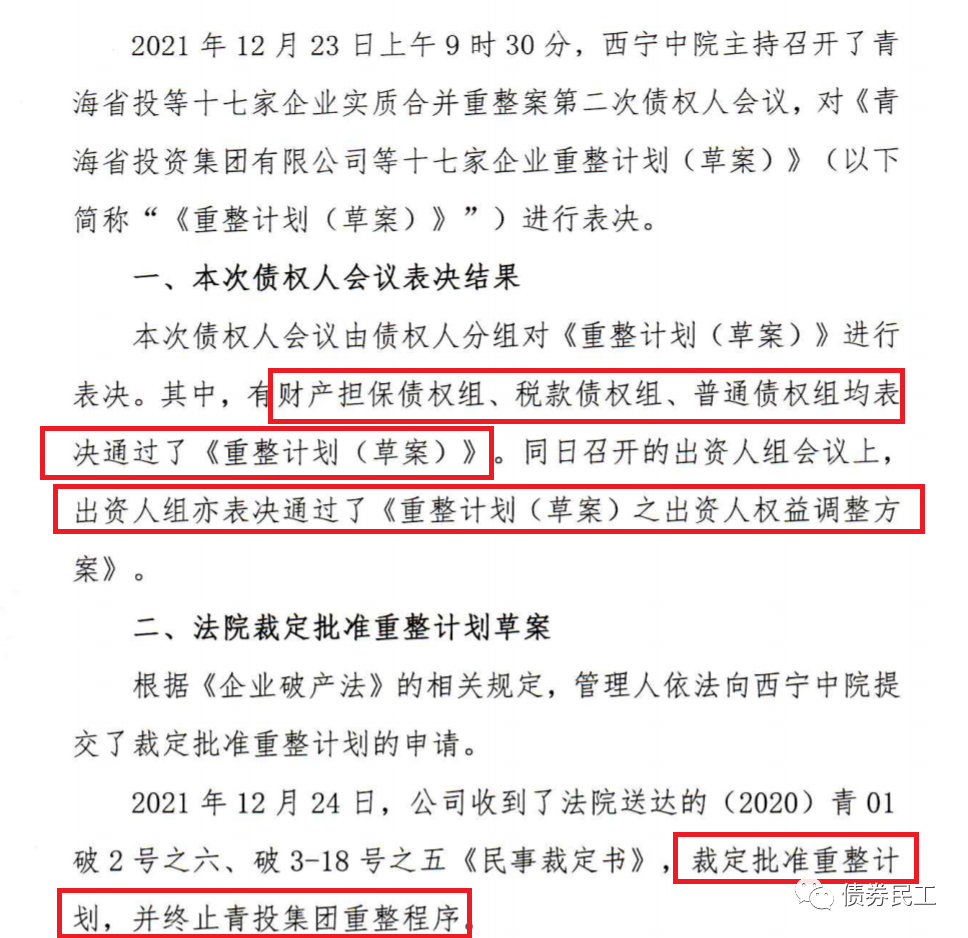 2021年還有個一非AAA的國有企業完成了債務重整計劃。雖然歷史最高主體信用等級只有AA,但是屬于省級國有企業,對于信用市場的影響并不小,這個發行人就是青海省投資集團有限公司。2021年12月27日,青海省投資集團有限公司公告,2021年12月23日財產擔保債權組、稅款債權組和普通債權組均表決通過了《重整計劃(草案)》;2021年12月24日,西寧中院批準了重整計劃。青海省投資集團有限公司目前最新主體信用等級為C,已經實質違約債券只數為2只,已經實質違約債券金額為10.08億元。