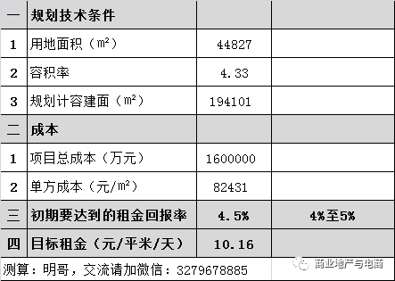 該地塊計(jì)容建面194101平米,總成本160億,折合單方82431元/平米,假設(shè)初期租金回報(bào)率要求4.5%,則目標(biāo)租金水平為: