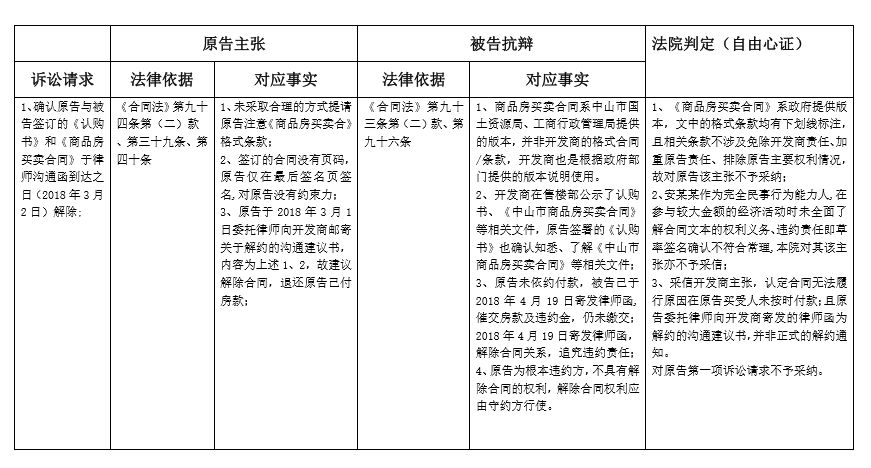 案情背景:原告安某向被告開發商認購一套商品房,分別于2017年6月8日、6月15日簽訂《認購書》、《中山市商品房買賣合同》,約定開發商將位于中山市西區某幢1001房(以下簡稱案涉商品房)出售給原告,原告于2017年6月8日、6月15日分別向被告交付定金20000元、首付款155420元,共176150元至指定被告賬戶。2018年3月1日,原告委托律師向被告發出律師溝通函,要求解除雙方簽訂的認購書及商品房買賣合同,要求開發商退還定金和購房款。被告不同意,業主遂向法院起訴。原告對自己提出的訴訟請求所依據的事實,以及被告反駁原告訴訟請求所依據的事實,以及法官根據法律規范(法律法規及相關司法解釋)及證據規則,在自由心證的基礎上認定如下表: