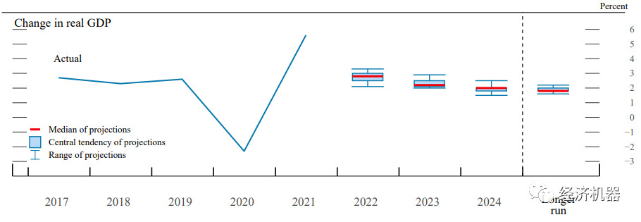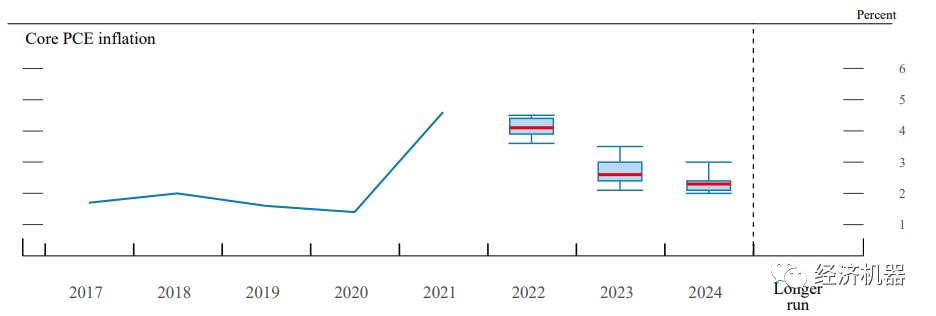 會(huì)議下調(diào)經(jīng)濟(jì)增速預(yù)期,上調(diào)通脹預(yù)期。會(huì)議GDP預(yù)測(cè)調(diào)低:預(yù)期2022年GDP增長(zhǎng)2.8%,較上次4%的預(yù)測(cè)明顯有所回落;2023年增長(zhǎng)2.2%,2024年增長(zhǎng)2.0%,更長(zhǎng)周期預(yù)計(jì)增長(zhǎng)1.8%,與上一次預(yù)測(cè)持平。通脹預(yù)測(cè)調(diào)高:預(yù)期2022年P(guān)CE通脹率為4.3%,兩年回落至2.3%;上年預(yù)測(cè)PCE2.6%,兩年回落至2.1%。預(yù)期2022年核心PCE通脹率為4.1%,兩年回落至2.3%;上年預(yù)測(cè)核心PCE為2.7%,兩年回落至2.1%。失業(yè)率預(yù)期2022、2023年為3.5%,更長(zhǎng)周期預(yù)期為4.0%,與此前持平。