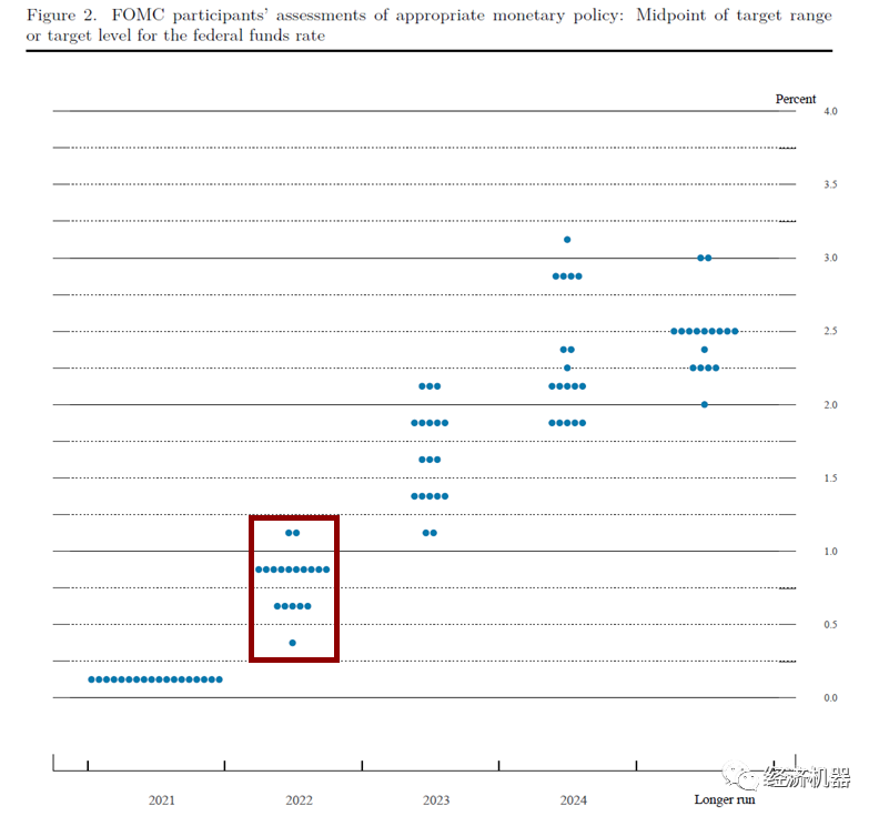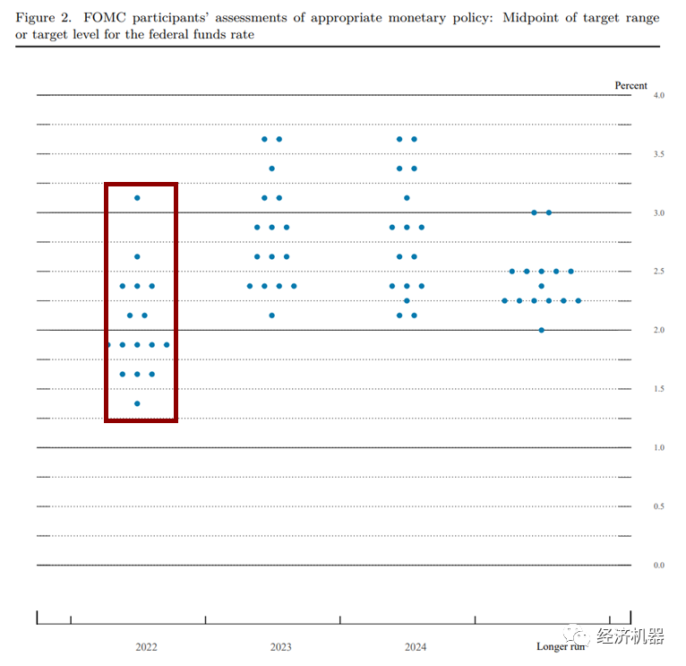 會(huì)議預(yù)測(cè)利率中樞抬升。會(huì)議預(yù)計(jì)2022年利率到1.9%(去年預(yù)測(cè)為0.9%),2023年年底利率將達(dá)到2.8%(去年為1.6%),2024年年底保持在2.8%(去年為2.1%),長(zhǎng)期利率預(yù)期中值為2.4%(去年為2.5%)。整體利率中樞較12月有明顯提升。