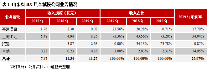 (3)業(yè)務(wù)情況:公司的主營業(yè)務(wù)包括基建項目、土地出讓和貿(mào)易三大板塊,其中基建項目、土地出讓均為傳統(tǒng)城投業(yè)務(wù),貿(mào)易業(yè)務(wù)則屬市場化業(yè)務(wù)。公司自2018年開始新增貿(mào)易業(yè)務(wù),主要銷售化工產(chǎn)品,采用代理采購模式,以實際采購價格及一定比例的加成確認(rèn)收入,前五大客戶銷售收入占比和前五大供應(yīng)商采購成本占比均超過80%,集中度均較高。2018年、2019年的貿(mào)易收入在總收入中的占比分別達(dá)到34.13%和23.78%,僅次于土地出讓收入。新增貿(mào)易業(yè)務(wù)雖然帶動公司營業(yè)收入規(guī)模大幅上漲,但該業(yè)務(wù)板塊的毛利率很低,盈利能力很差,未能在提升公司的償債能力方面發(fā)揮積極作用。實際上,在新增貿(mào)易業(yè)務(wù)之后,公司的經(jīng)營活動凈現(xiàn)金流反而由正轉(zhuǎn)負(fù),而且持續(xù)變差,無法對公司有息債務(wù)形成有效覆蓋,2019年和2020年的經(jīng)營活動凈現(xiàn)金流/總有息負(fù)債分別為-0.25和-0.29。