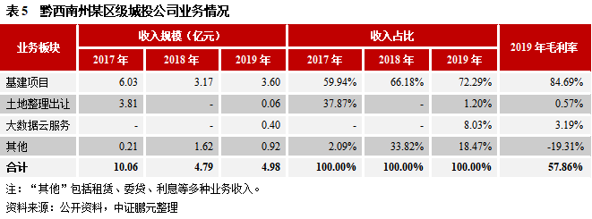 (3)業(yè)務(wù)情況:公司業(yè)務(wù)包括基建項目、土地整理出讓、大數(shù)據(jù)云服務(wù)等板塊,其中基建項目、土地整理出讓均為傳統(tǒng)城投業(yè)務(wù),大數(shù)據(jù)云服務(wù)則屬市場化業(yè)務(wù)。除了上述三大業(yè)務(wù)板塊,公司還有一些其他的業(yè)務(wù)。2017-2019年其他業(yè)務(wù)收入分別為0.21億元、1.62億元、0.92億元,在總收入中的占比分別為2.09%、33.82%、18.47%,毛利率分別為96.00%、-4.54%、-19.31%(見表5)。根據(jù)公司披露的信息,來自于其他業(yè)務(wù)的收入中主要系由子公司鈞鵬建設(shè)的建筑施工所產(chǎn)生的,但2018年、2019年該業(yè)務(wù)產(chǎn)生的收入金額在其他業(yè)務(wù)收入中的占比均不足六成,而其余的收入系由哪些業(yè)務(wù)產(chǎn)生則無法得知。綜上可知,近兩年公司其他業(yè)務(wù)所產(chǎn)生的收入規(guī)模較大,僅次于基建項目,但其毛利率均為負(fù)數(shù),且存在部分收入來源難以查明的情形。