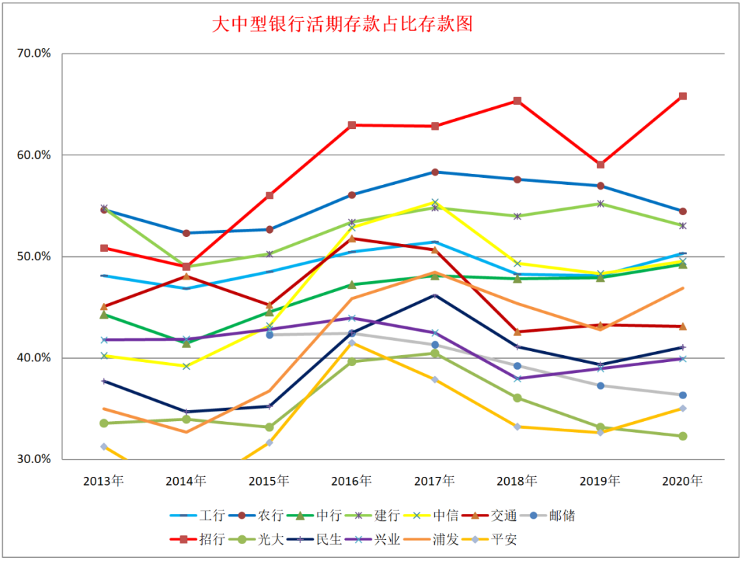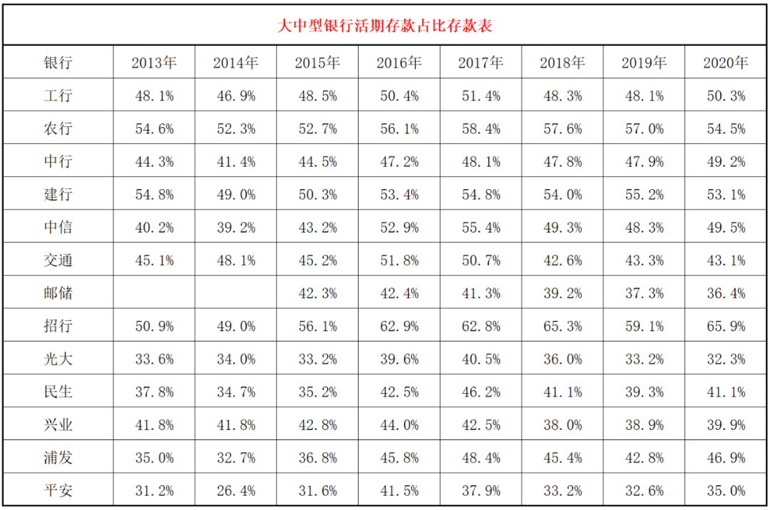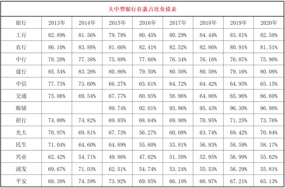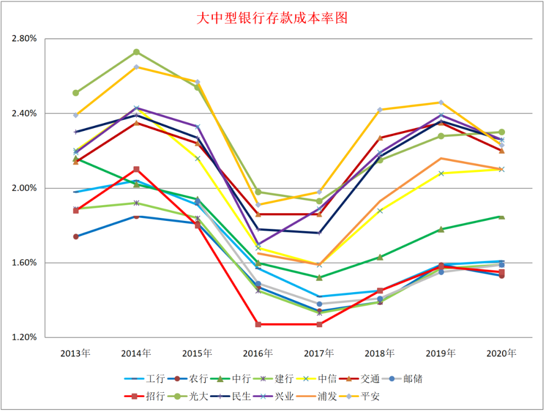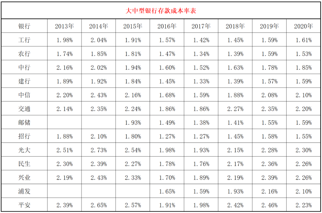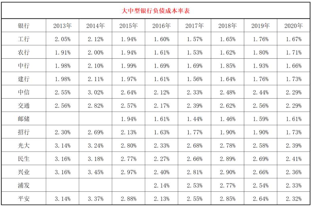 6、負債總成本情況。這是本文最后的落腳地,總的負債成本低才是真正的原料便宜,負債總成本低的銀行,可以在相對保守的資產配置下依然獲得較高的凈息差,依然可以保持較高的凈利息收益率。從2020年的數據看,郵儲銀行1.61%、中國銀行1.66%、工商銀行1.67%、農業銀行1.71%、建設銀行和招商銀行并列為1.73%。負債總成本最高的是民生銀行2.41%、光大銀行2.39%、興業銀行2.36%、浦發銀行2.33%和平安銀行2.32%。過去八年平均數據看,成本最低的是農業銀行1.77%、建設銀行和工商銀行1.80%、中國銀行1.86%、招商銀行2.01%;成本最高的是興業銀行2.84%、民生銀行2.75%、平安銀行和光大銀行2.74%(平均八年郵儲銀行和浦發銀行數據不全未列入)。可以看出,四大行、郵儲銀行和招商銀行負債總成本要比其他股份制銀行低60-70個基點。