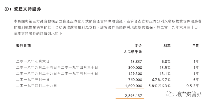 第三,資產(chǎn)支持證券。融創(chuàng)中國(guó)全資附屬子公司融創(chuàng)物業(yè)服務(wù)集團(tuán)有限公司及融創(chuàng)房地產(chǎn)于第三方融資機(jī)構(gòu)簽訂資產(chǎn)化證券形式的資產(chǎn)支持專項(xiàng)協(xié)議。該資產(chǎn)支持證券以收取物業(yè)管理服務(wù)費(fèi)和物業(yè)銷售款項(xiàng)為資金支持,共計(jì)29億元人民幣。