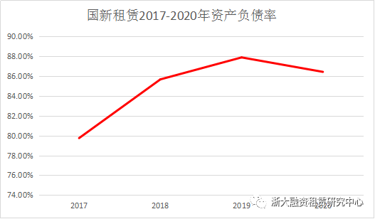 國新租賃2016-2020年度總資產分別為7.72億元、102.14億元、224.16億元和346.73億元、402.8億元,2018年較2017年同比增長119.46%,2019年較2018年同比增長54.68%,2020年較2019年同比增長16.17%。此外,負債規模也逐漸攀升,由2017年的81.46億元逐漸升至2021一季度的358.73億元,資產負債率始終保持較高狀態。