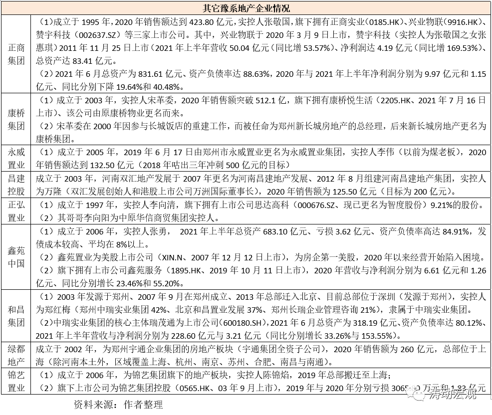 (二)在河南本地金融生態(tài)環(huán)境遭到永煤事件沖擊以及地產(chǎn)政策收緊之后,豫系地產(chǎn)企業(yè)的流動性壓力面臨空前挑戰(zhàn),這一方面與豫系地產(chǎn)企業(yè)的高杠桿率有關(如建業(yè)的資產(chǎn)負債率高達92.10%、正商的資產(chǎn)負債高達88.63%、鑫苑的資產(chǎn)負債率高達84.91%等),另一方面也與疫情、政策等突發(fā)事件有關。基于此,我們認為豫系地產(chǎn)企業(yè)正處于危急關頭,面臨的生存壓力不小。例如,鑫苑中國今年上半年虧損了3.62億元、錦藝置業(yè)2020年虧損了1.83億元。
