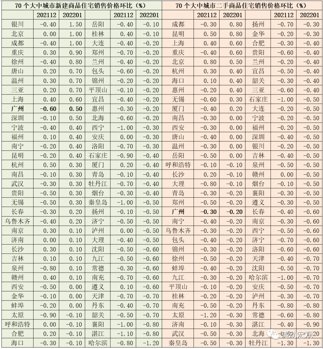 二、如果將廣州地區下調房貸利率和今年國家統計局發布的一組數據結合在一起理解則會更有意思。2022年2月21日,國家統計局發布2022年1月份70個大中城市商品住宅銷售價格變動情況,具體數據如下: