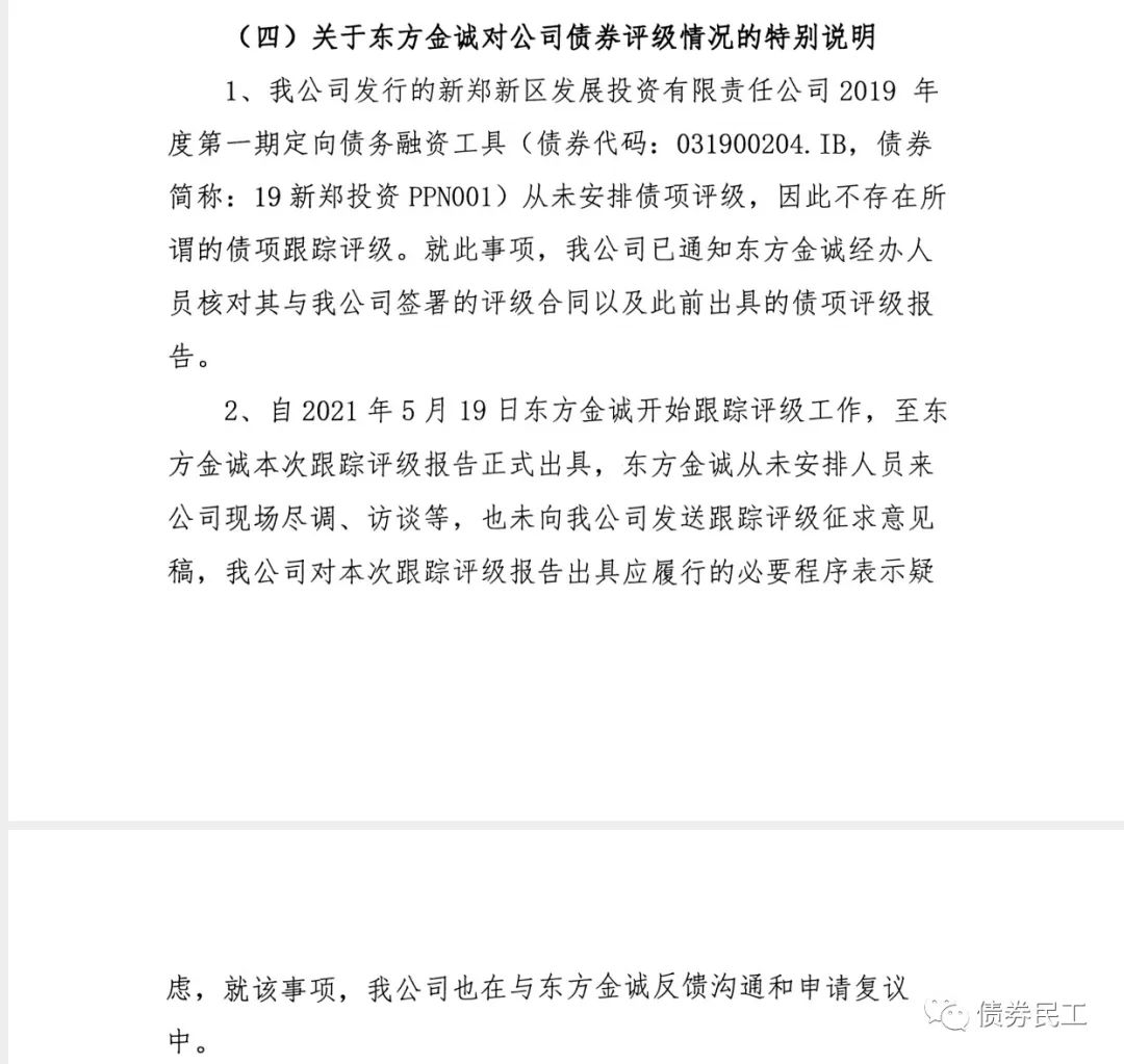 2021年6月29日,東方金誠的跟蹤評級報告評定新鄭新區發展投資有限責任公司(以下簡稱“新鄭投資”)發行的“18新鄭投資PPN001”和“19新鄭投資PPN001”的主體評級為AA+,評級展望由穩定調整為負面。新鄭投資在2021年7月2日發布了《關于東方金誠國際信用評估有限公司調整公司評級展望的公告》,明確申明了兩個特別說明:一是新鄭投資認為 “19新鄭投資PPN001”未做債項評級安排;二是新鄭投資認為東方金誠跟蹤評級未進行現場盡調訪談、也未征求公司意見,評級報告出具未履行必要流程,正在申請復議中。