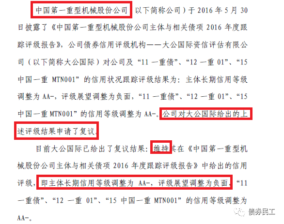 從實踐來看,信用債券市場上發行人對于評級機構的評級結果公開提出異議的情況并不多。債券民工印象中比較深的發行人對信用評級就結果公開提出異議并進行復議的是中國第一重型機械股份公司在2016年對評級結果提出了異議并進行復議,但是復議結果還是維持了主體長期信用等級為AA-,評級展望調整為負面的結果。