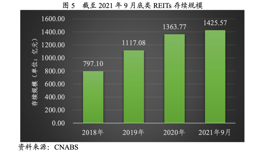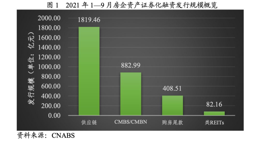 從發(fā)行情況來(lái)看,2021年1~9月,房企資產(chǎn)證券化產(chǎn)品發(fā)行總規(guī)模為3418.92億元,同比下降2.59%;其中供應(yīng)鏈ABS/ABN、CMBS/CMBN、類REITs和購(gòu)房尾款為最主要的發(fā)行品種,發(fā)行規(guī)模分別為1819.46億元、882.99億元、82.16億元和408.51億元,如下圖所示。