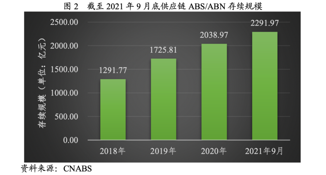 供應(yīng)鏈融資以房企應(yīng)付賬款為基礎(chǔ)資產(chǎn),采用“1+N”反向保理模式,以單一核心企業(yè)及其下屬公司為債務(wù)人的供應(yīng)鏈資產(chǎn)證券化產(chǎn)品在解決上游供應(yīng)商資金回籠。近三年,房企供應(yīng)鏈融資存續(xù)規(guī)模呈逐年遞增態(tài)勢(shì)。截至2021年9月底,房企供應(yīng)鏈存續(xù)規(guī)模2291.97億元,其中前三大房企(萬(wàn)科企業(yè)股份有限公司、碧桂園地產(chǎn)集團(tuán)有限公司和保利發(fā)展控股集團(tuán)股份有限公司)存續(xù)金額[4]分別為685.75億元、162.19億元和160.48億元。