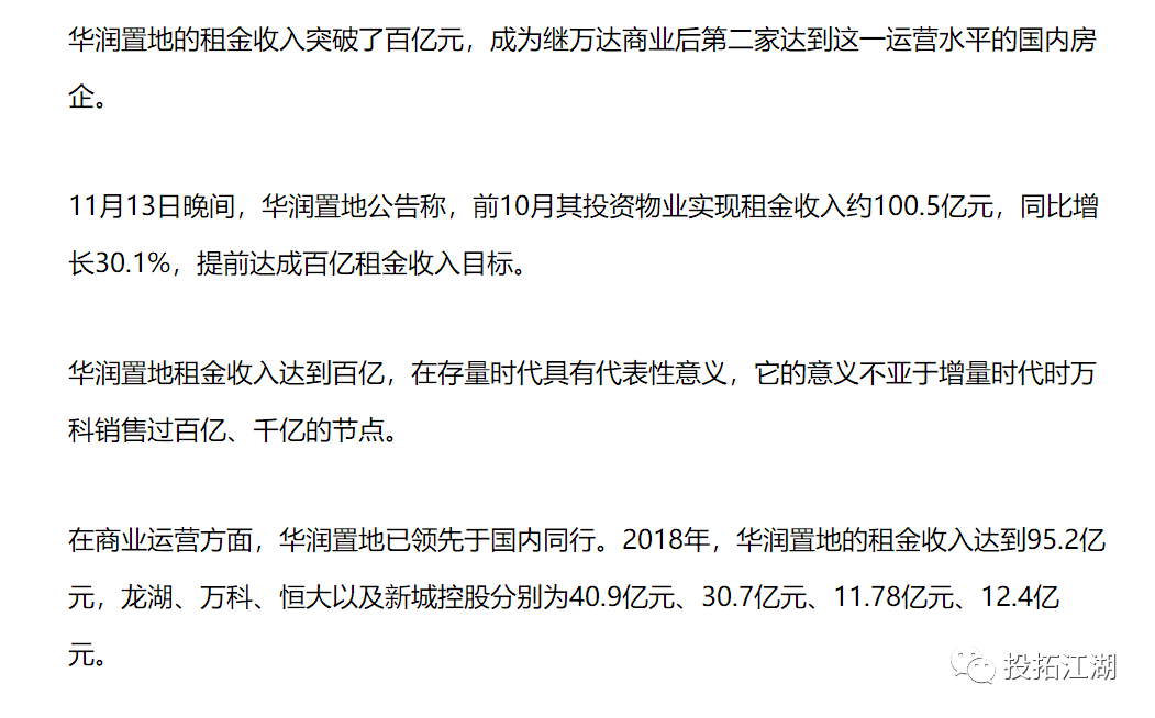 國內關注存量資產,做商業運營的優秀代表,如華潤置地的租金收入已破百億,未來的市場大有可期。
