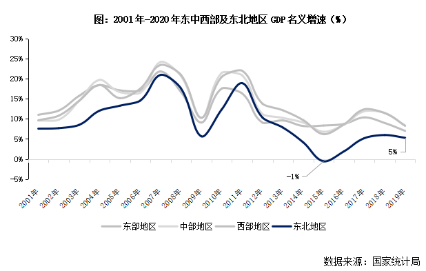 經濟層面,東北地區GDP增速大幅落后其他地區。隨著國民經濟的發展,東北地區普遍以傳統重工業為主的第二產業對整體經濟增長的支撐愈發有限。隨著地區資源逐漸枯竭,產能落后下東北地區GDP名義增速自2012年起逐步下行,2015年甚至同比負增長1%。至2019年雖有所回升,但GDP名義增速僅5%,大幅落后于東中西部地區。