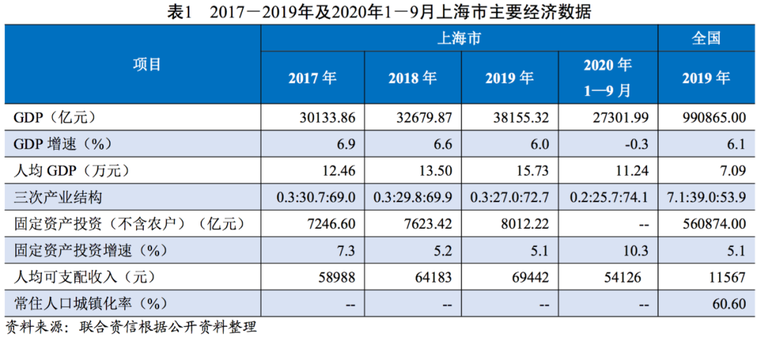 從經濟運行方面看,上海市作為長江三角洲的核心城市,全國國際經濟、金融、貿易、航運以及科技創新中心,經濟體量大且持續增長,但增速有所放緩。2017-2019年,上海市實現地區生產總值(GDP)分別為30133.86億元、32679.87億元和38155.32億元,持續增長,2019年GDP總量居全國各省市第10位,較2018年提升1位。從增速看,2017-2019上海市GDP增速分別為6.9%、6.6%和6.0%,與全國水平基本保持一致,但受土地面積限制以及產業轉型升級等因素影響,上海市經濟增速有所放緩。同期,上海市人均GDP分別為12.46萬元、13.50萬元和15.73萬元,較其余國內一線城市相比仍處于較高水平,2019年僅次于北京市位列第二位。產業結構方面,上海市主要以服務業為主,三次產業結構由2017年的0.3:30.7:69.0調整為2019年的0.3:27.0:72.7,第三產業占比持續提升,產業結構更趨優化。固定資產投資方面,2017年-2019年,上海市全年固定資產投資分別為7246.60億元、7623.42億元和8012.22億元,與GDP的比值分別為24.04%、23.33%和21.00%。上海市工業基礎強大,2019年完成工業總產值35487.05億元,實現工業增加值9670.68億元,其中電子信息產品制造、汽車制造、石油化工及精細化工制造、精品鋼材制造、成套設備制造和生物醫藥制造六個重點行業占比為67.6%,并形成了以節能環保、新一代信息技術、生物、高端裝備、新能源、新能源汽車、新材料等為代表的工業戰略性新興產業,完成相關產業工業總產值11163.86億元,實現相關產業工業增加值6133.22億元,比上年增長8.5%。隨著金融開發創新的持續深入和推進,上海市作為全國金融中心,其金融業增加值保持較高增速,2019年實現金融業增加值6600.60億元,比上年增長11.6%。總體看,上海市經濟發展態勢良好,產業結構更趨優化。