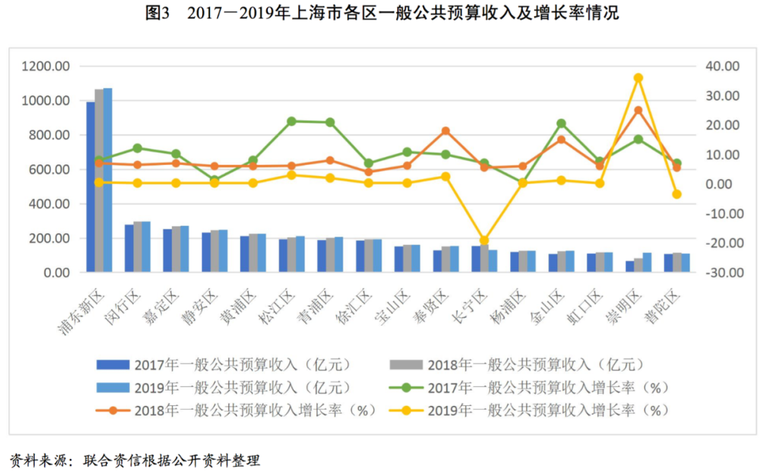 從一般預算收入增速來看,2017—2019年,崇明區一般預算收入增速分別為15.11%、25.0%和35.96%,快速提升,2019年其他各區一般預算收入增速均在3.0%以下,較過去兩年均有明顯放緩,且長寧區和普陀區一般預算收入出現下降,分別下降19.17%和3.49%。