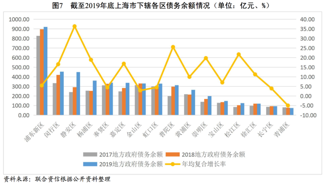 從債務層面看,上海市下轄各區中,浦東新區政府債務余額最大,其次是閔行區、靜安區,分別達到921.03億元、453.90億元和449.91億元,楊浦區、奉賢區、嘉定區、金山區、虹口區和普陀區6個轄區政府債務余額均在300至400億元之間。2017-2019年,除青浦區外,上海市下轄各區政府債務余額均呈上升趨勢,其中靜安區和楊浦區政府債務余額增長較快,年均復合增長率分別為36.35%和25.55%,松江區、崇明區、嘉定區、楊浦區和閔行區政府債務余額年均復合增長率在20%左右,奉賢區、金山區、虹口區和長寧區政府債務余額年均復合增長率在5%以內。