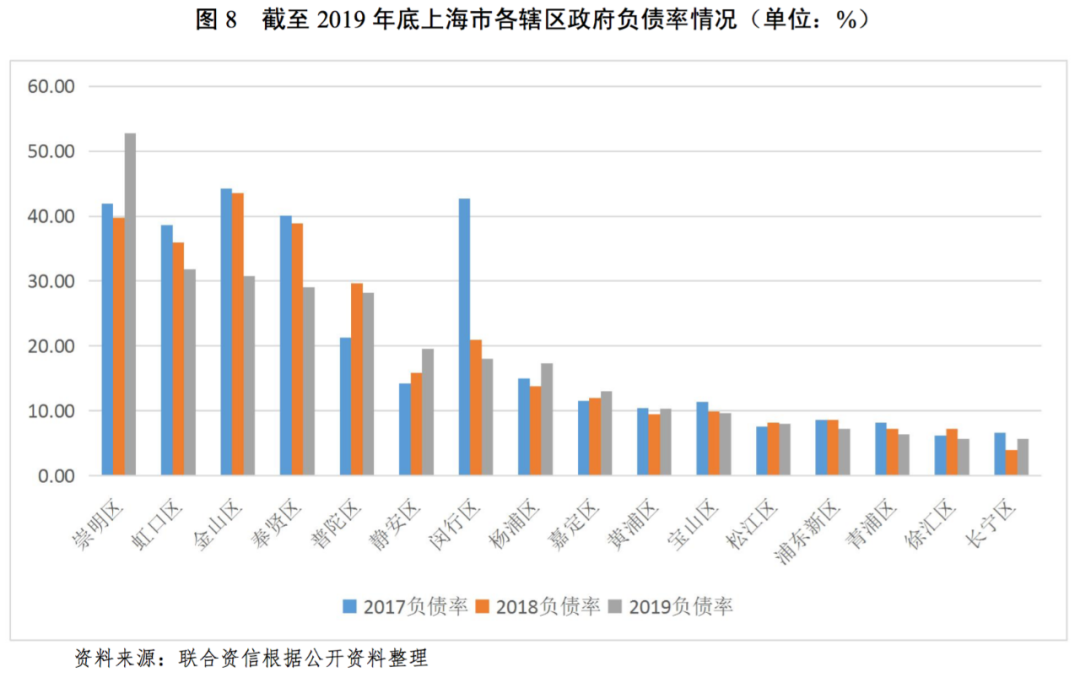 償債能力方面,截至2019年底,靜安區、普陀區、虹口區、楊浦區和金山區5個轄區政府債務率達到100%以上,增幅較快;嘉定區、黃浦區、閔行區和奉賢區4個轄區政府負債率在75%~95%之間,徐匯區、長寧區、崇明區、寶山區和浦東新區5個轄區政府負債率在30%~65%之間,松江區和青浦區政府債務率低于30%。整體看,上海市各轄區政府債務率有所分化,部分核心城區債務率較高,償債能力有所下降。