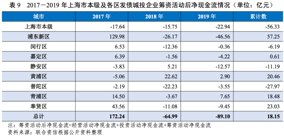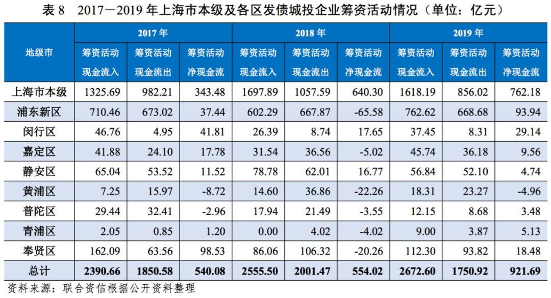 2019年,上海市發債城投企業債務負擔同比略有上升,但整體處于較輕水平,而靜安區和普陀區的債務負擔在區域內相對較重。同期,上海市發債城投企業籌資活動力度有所加強。近兩年,上海市本級及各區發債城投企業籌資活動后凈現金流多數為小幅凈流出。未來三年到期債券規模較大的為上海市本級、浦東新區和靜安區,其余各區到期債務規模很小,需關注債務負擔較重、到期債券規模較大且籌資活動后凈現金流出的區域內城投企業的再融資情況。