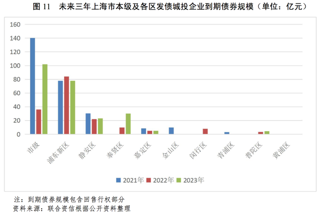 從上海市本級及各區發債城投企業未來三年(2021—2023年)到期債券規模來看,上海市本級和浦東新區的城投企業未來三年集中到期債券規模大,靜安區和奉賢區到期規模相對較小,其余各區到期債券規模很小。