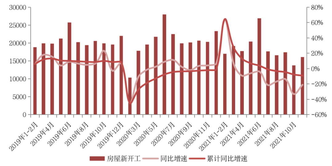 11月全國房屋新開工表現回暖,共計16084萬平方米,環比增17%。但較2020年和2019年同期分別下降21%和17.8%。規模上來看仍處于歷史較低水平。1-11月房地產開發企業到位資金同比增速較1-10月收窄1.6pct。民營開發企業在銷售回款難和融資借款難的雙重困境下,繼續新開工項目存在一定壓力。