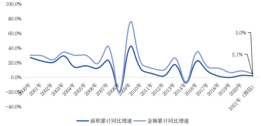 12月,中央重申房地產行業“支柱產業”地位和強調行業“良性循環和健康發展”,并實施降準0.5個百分點,釋放資金1.2萬億元。政策暖風將對恢復市場信心和促進行業平穩發展起到積極作用。假設12月保持11月商品房銷售同比增速估算, 預計2021年全年商品房銷售規模將再創新高,面積和金額分別增2.1%和5%。以過往5年前11月銷售規模占比平均值估算,2021年全年商品房銷售面積和金額也將同比分別增長4%和7.8%。