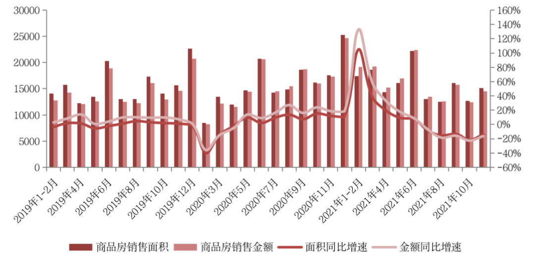 國家統計局數據顯示,2021年1-11月,商品房銷售面積158131萬平方米,同比增長4.8%;比2019年1-11月增長6.2%,兩年平均增長3.1%。其中,住宅銷售面積增長4.4%,辦公樓銷售面積增長2.0%,商業營業用房銷售面積下降2.6%。商品房銷售額161667億元,增長8.5%;比2019年1-11月增長16.3%,兩年平均增長7.8%。其中,住宅銷售額增長9.3%,辦公樓銷售額下降3.0%,商業營業用房銷售額下降2.2%。