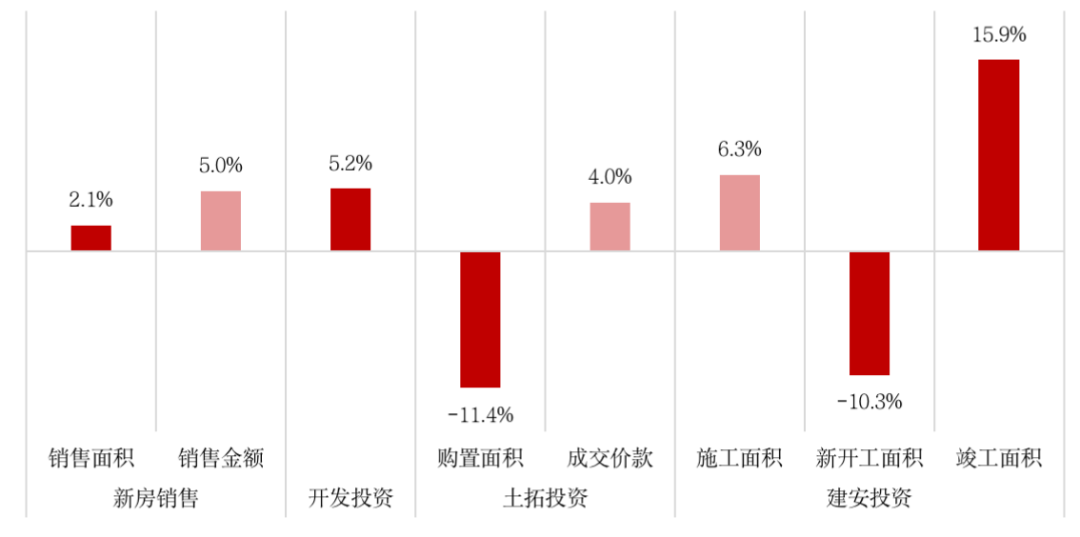 國家統計局數據顯示,1-11月,房地產開發企業房屋施工面積959654萬平方米,同比增長6.3%。房屋新開工面積182820萬平方米,下降9.1%。房屋竣工面積68754萬平方米,增長16.2%。施工面積和竣工面積較1-10月增幅分別收窄了0.8pct和0.2pct,新開工面積則降幅擴大1.4pct。