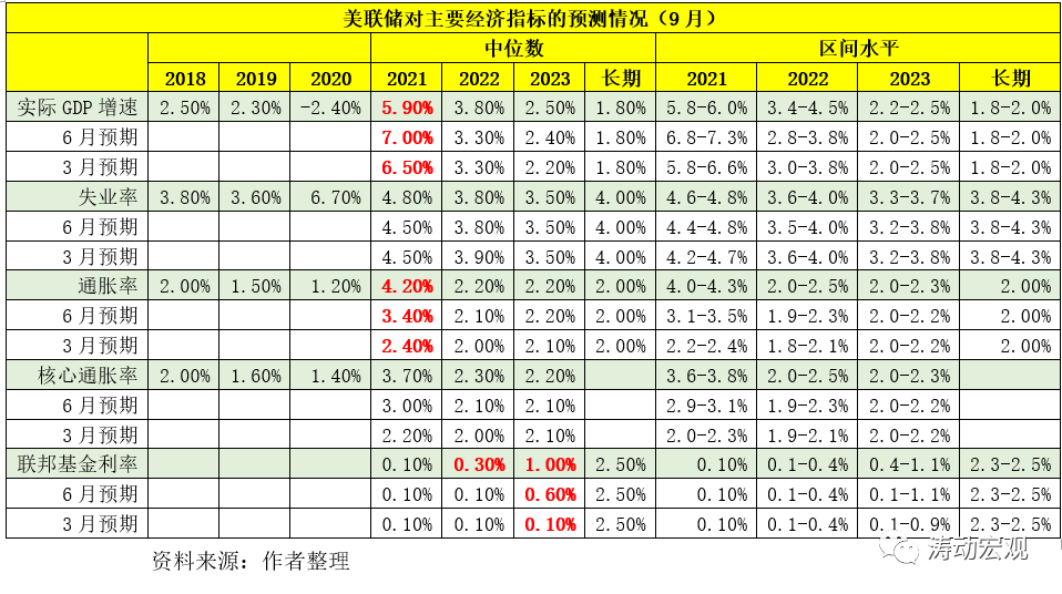相較于6月議息會議,9月議息會議將2022年和2023年的聯邦基金目標利率預期分別由0.10%和0.60%上調至0.30%和1%,即分別上調了20BP和40BP。在失業率預期上升的情況下,還上調了2022-2023年的聯邦基金目標利率預期,這意味著美聯儲目前對失業率的容忍度,這種情況下即便失業率不夠理想,也不會阻擋美聯儲加息步伐。