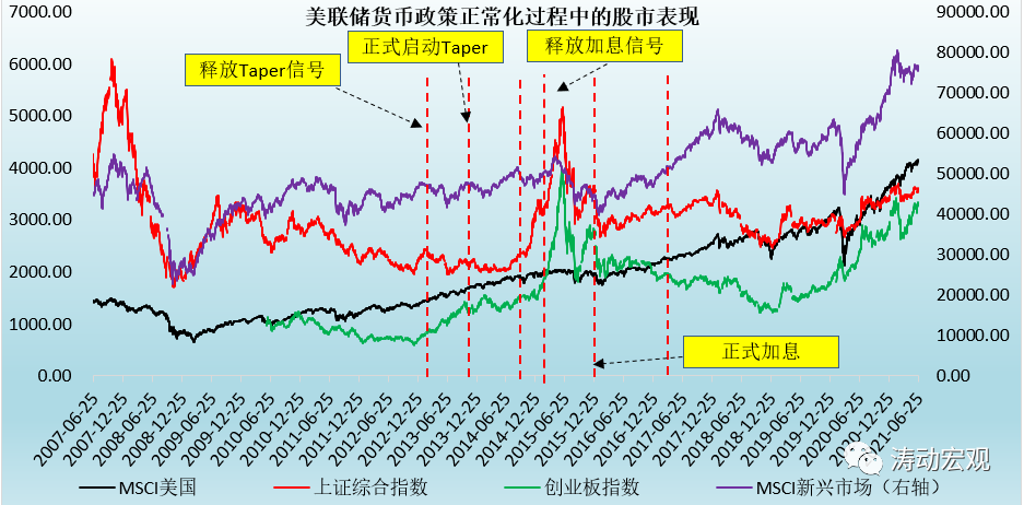 2、而在Taper以及加息的預期過程中,受資本外流、本幣貶值等因素影響,新興市場股市的波動幅度有所擴大,且傾向于下挫。