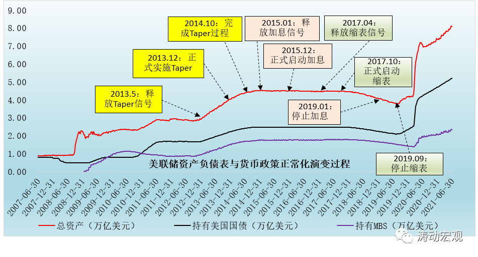 前面已經指出,美聯儲的貨幣政策正常化路徑基本上遵循“向市場釋放Taper信號——Taper過程——向市場釋放加息信號——加息——向市場釋放縮表信號——正式縮表”的邏輯脈絡。