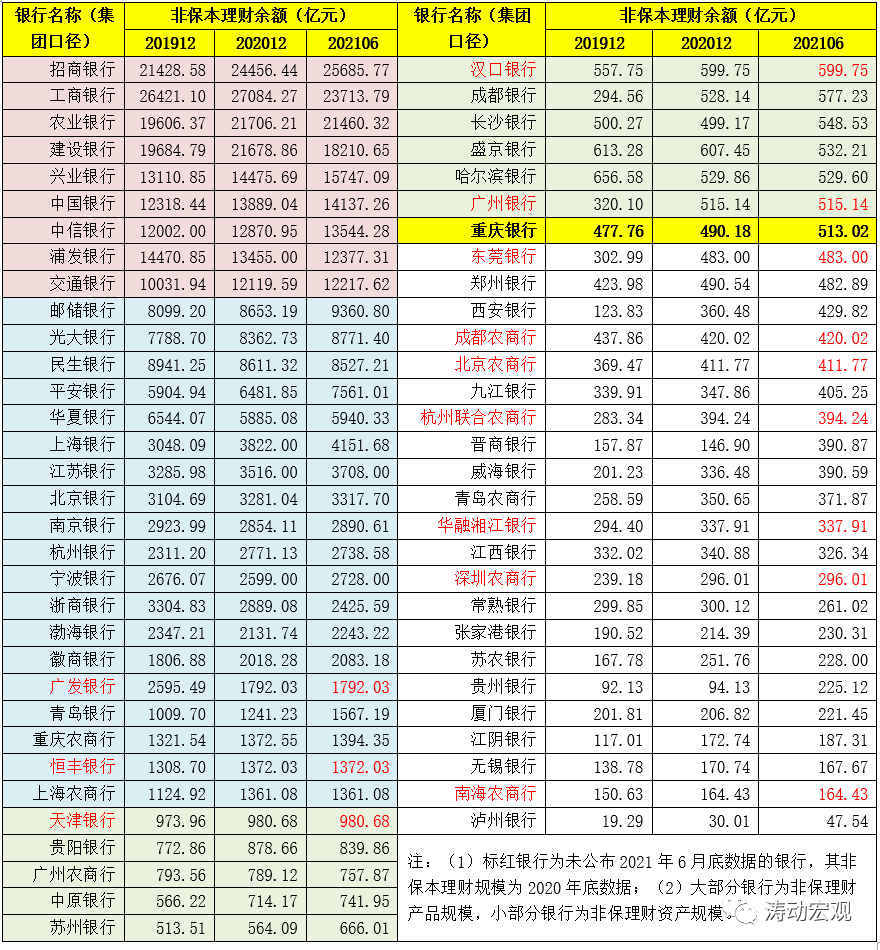 3、除以上28家銀行外,還有13家銀行的非保理財規模超過了500億元,從高到低依次為天津銀行、貴陽銀行、廣州農商行、中原銀行、蘇州銀行、齊魯銀行、漢口銀行、成都銀行、長沙銀行、盛京銀行、哈爾濱銀行、廣州銀行以及重慶銀行。這13家銀行的非保本理財規模加在一起不足8000億元,未來的規模大概率也會不斷被壓縮。