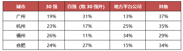 第三類城市的租賃用地出讓分布相對(duì)均衡,包括廣州、杭州、福州合肥等。此類城市吸引的房企類型相對(duì)多元化,且廣州本土的越秀、杭州本土的濱江、綠城等已經(jīng)發(fā)展為百?gòu)?qiáng)甚至30強(qiáng)房企,此類房企積極布局大本營(yíng),也降低了本土平臺(tái)公司托底的“壓力”,最終租賃用地的分布也更加均衡。