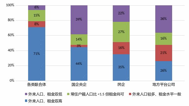 而地方平臺(tái)公司拿地一般以“托底”為主,而外來人口、租金雙低的城市更需要托底,因此占比最高,達(dá)到36%,與此同時(shí)地方平臺(tái)公司在外來人口和租金雙高的城市持有租賃用地的比例在各類型企業(yè)中最低。可見地方平臺(tái)公司拿地的對(duì)盈利性的要求相對(duì)較低,主要是為保證地方租賃用地供應(yīng)計(jì)劃的完成。
