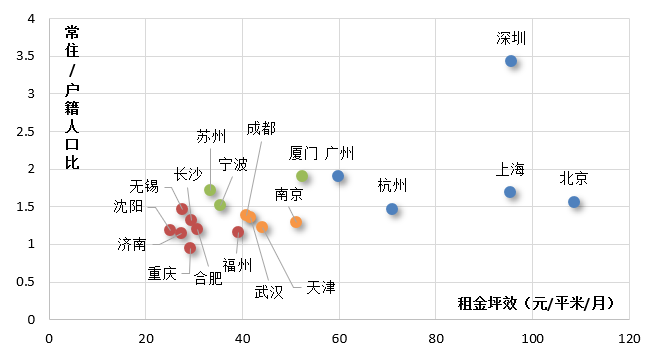 外來人口是城市發(fā)展租賃用房的根基,對(duì)租賃住房的需求量、價(jià)格均有較大的影響,常住戶籍人口比越大的城市,外來人口越多,租賃市場(chǎng)潛力越大;另一重要因素則是租金,租金越高的城市,對(duì)于房企而言租賃資產(chǎn)更加優(yōu)質(zhì)。