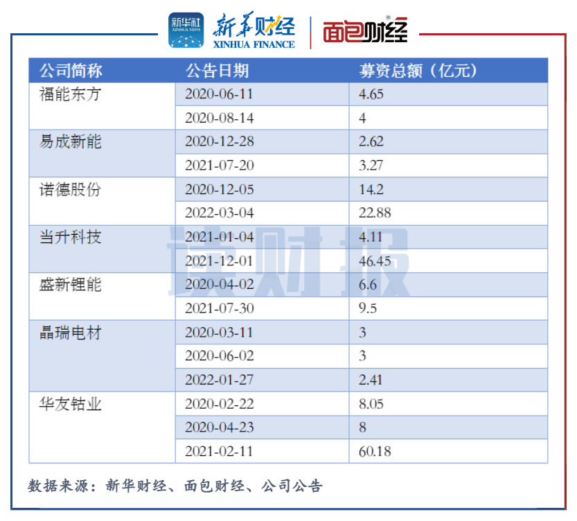 諾德股份在2020年12月和2022年3月通過定增分別募資14.2億元和22.88億元。當升科技在2021年1月和12月通過定增分別募資4.11億元和46.45億元。華友鈷業在2020年2月、4月和2021年2月通過定增分別募資8.05億元、8億元和60.18億元。其余還有四家鋰電池板塊上市公司均完成兩次及以上定增募資。