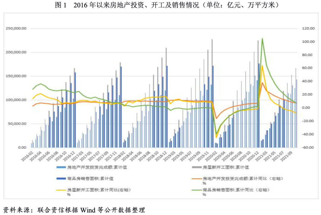 2015?2019年,房地產開發相關數據累計值呈持續上升趨勢;2020年受疫情影響,疊加7月底出臺的地產“三道紅線”的調控政策,房地產開發相關數據走弱。2021年以來,融資環境趨緊疊加地區房地產拿地政策持續趨嚴,房地產開發投資完成額、商品房銷售面積、房屋新開工面積的相關指標絕對值均小于去年同期。此外,受新冠疫情影響,2020年初,房地產開發相關指標累計同比大幅下降;2021年一季度,房地產開發相關指標累計同比大幅好轉,主要系上年同期相關指標較低,但自4月以來,房地產開發相關指標累計同比持續下降,房地產調控政策在行業供給端逐漸顯現作用,預計短期內房地產投資增速或將繼續維持下行趨勢。