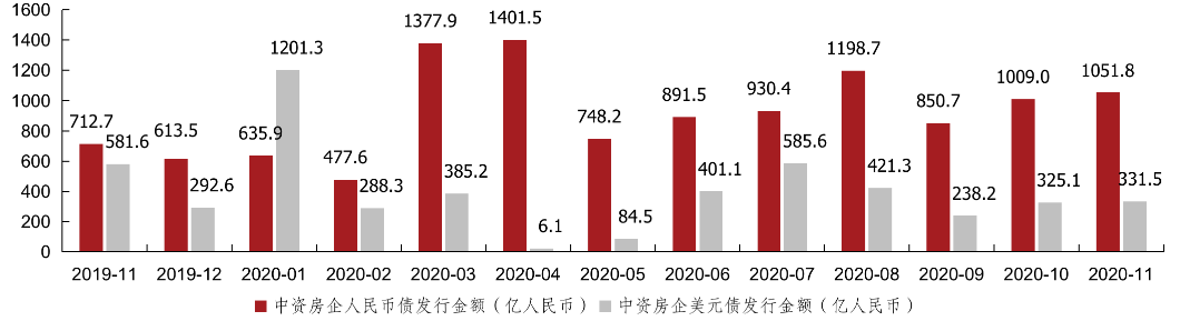 克而瑞證券數據顯示,2020年前11月,房企人民幣債累計發行10573億元,同比增加19.7%、美元債累計發行4268.2億元,同比減少23.6%。