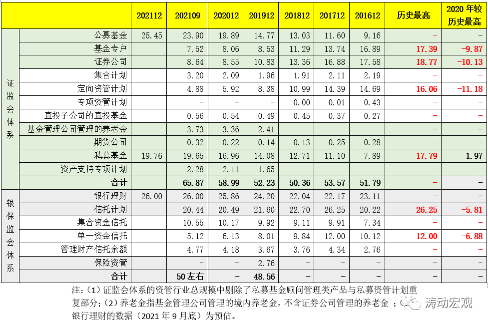 1、以2021年9月底的數據為例,證監會體系下的資產管理行業規模合計達到65.87萬億,銀保監會體系下的資產規模亦有50萬億左右,也即兩大體系的資產管理行業規模合計在110萬億-120萬億之間。