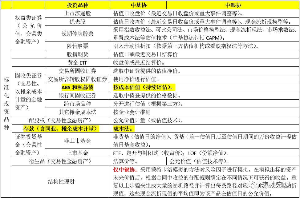 目前就整個大資管行業來看,資管新規、理財新規、中基協的估值指引以及中銀協的理財產品會計核算指引和理財產品核算估值指引算是針對資管產品估值最權威和最基本的指引性政策文件,且均鼓勵對資管產品以公允價值(含市價)方法進行估值。