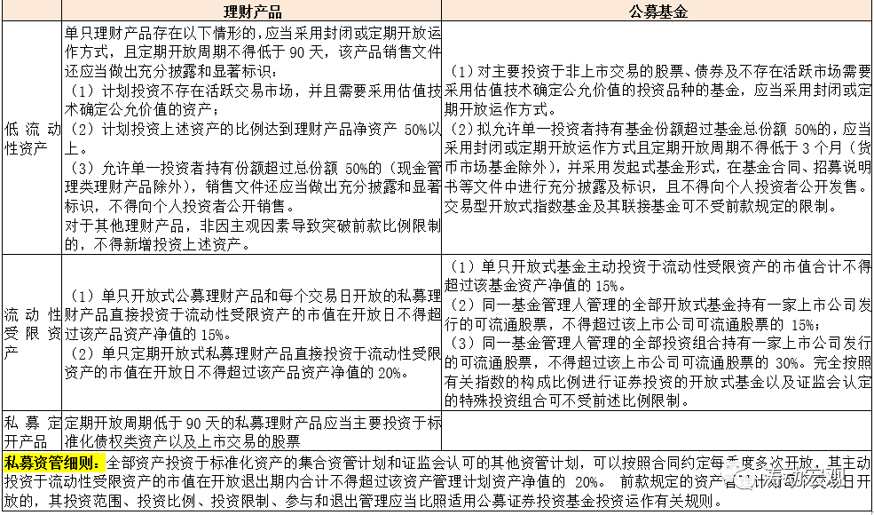 1、《資管新規》明確,流動性風險管理辦法由各資管細分行業監管部門制定。截至目前,證監會已于2017年8月31日發布《公開募集開放式證券投資基金流動性風險管理規定》(證監會(2017)12號公告),《私募資管細則》對私募資管產品的流動性管理也做出了特別規定,而銀保監會亦于2021年12月10日發布了《理財公司理財產品流動性風險管理辦法》。