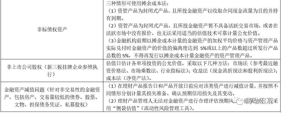 2、考慮到部分資產尚不具備以市值計量的條件,過渡期內封閉期在半年以上的定期開放式資管產品、銀行現金管理類理財產品(當然這里也包括貨幣市場基金)適用攤余成本計量。