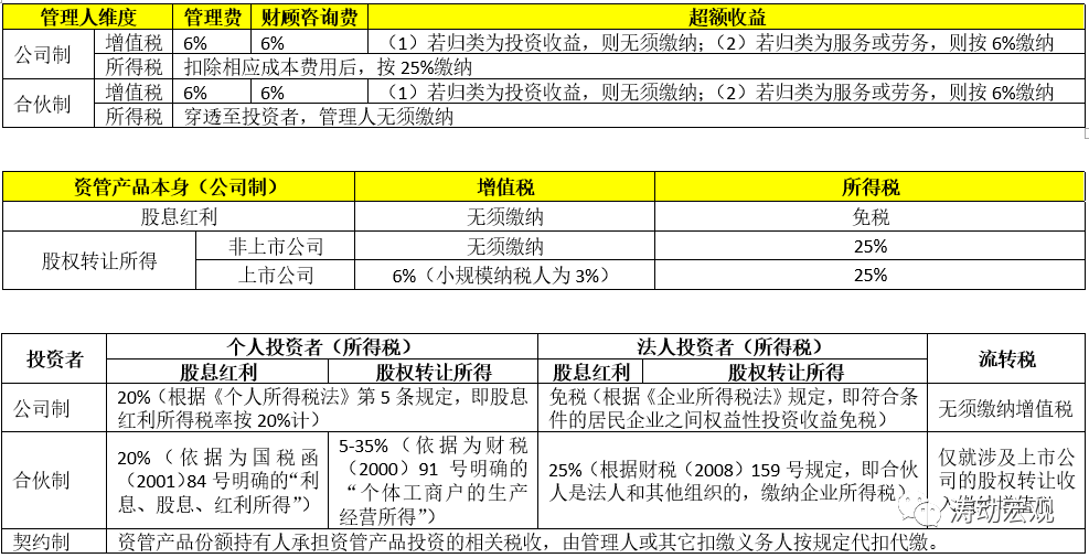 5、資管產品的投資者來看,要比管理人、資管產品本身更復雜一些,特別是在所得稅方面。其中,個人投資者均須繳納所得稅,法人投資者在公司制下可以免繳所得稅(合伙制為25%)。