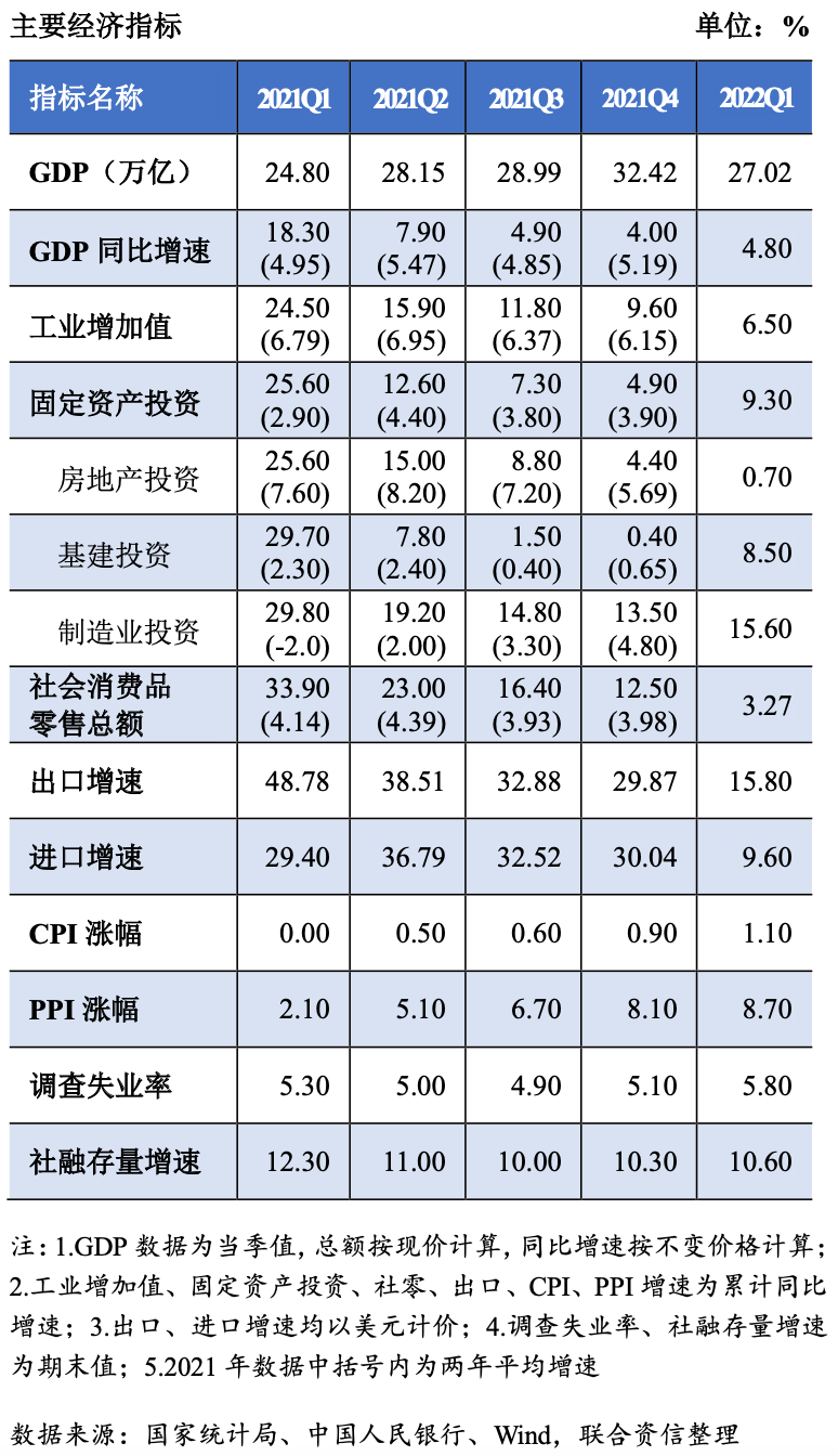 2022年一季度,國際形勢更趨復雜嚴峻,國內疫情呈現點多、面廣、頻發的特點,對經濟運行的沖擊較大。經初步核算,一季度國內生產總值27.02萬億元,不變價同比增長4.80%,較2021年四季度兩年平均增速[1](5.19%)有所回落;環比增長1.30%,雖高于2021年但不及疫情前水平。3月消費、汽車產銷以及房地產鏈條等相關指標增長放緩,基建投資、財政提前發力對經濟形成一定的支撐。