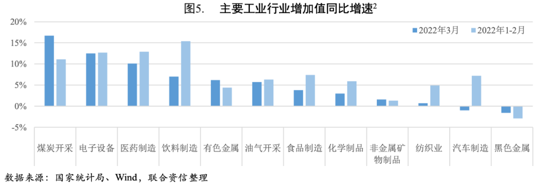 3月工業生產低迷拖累一季度整體增速。2022年一季度,在一系列工業經濟增長政策措施持續作用下,工業經濟運行總體平穩,規上工業增加值同比增長6.50%,1-2月工業生產增長總體較為強勁,3月受疫情防控措施影響,部分企業出現減產停產,物流供應鏈受到沖擊,工業增加值同比增速大幅回落至5%,明顯低于季節性水平,拖累一季度整體增速。
